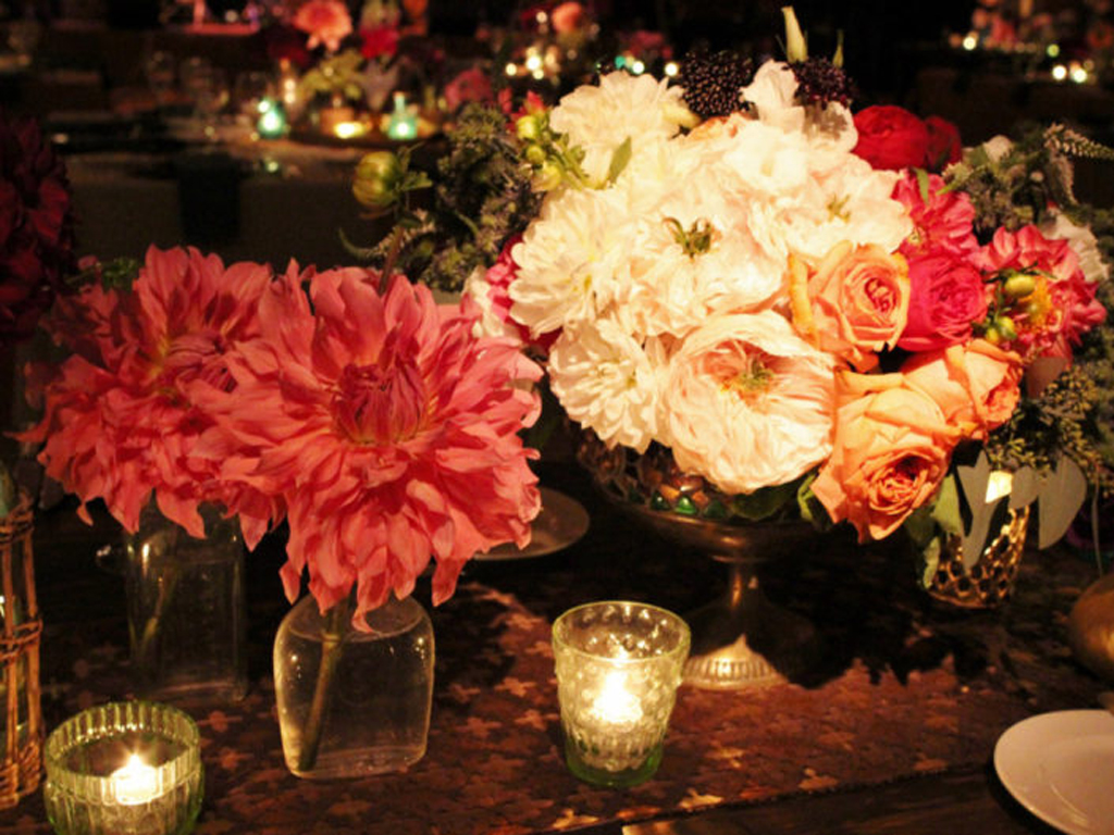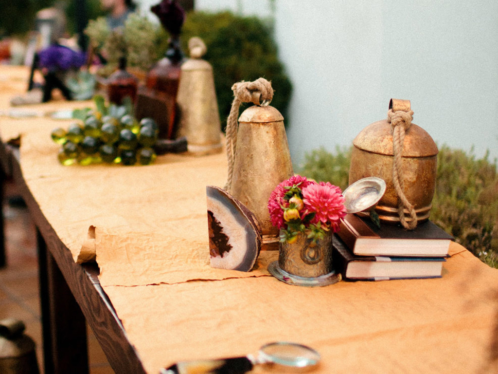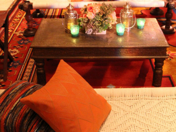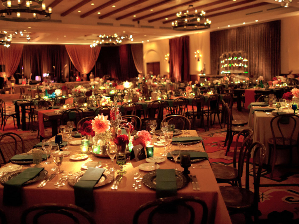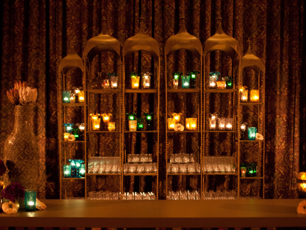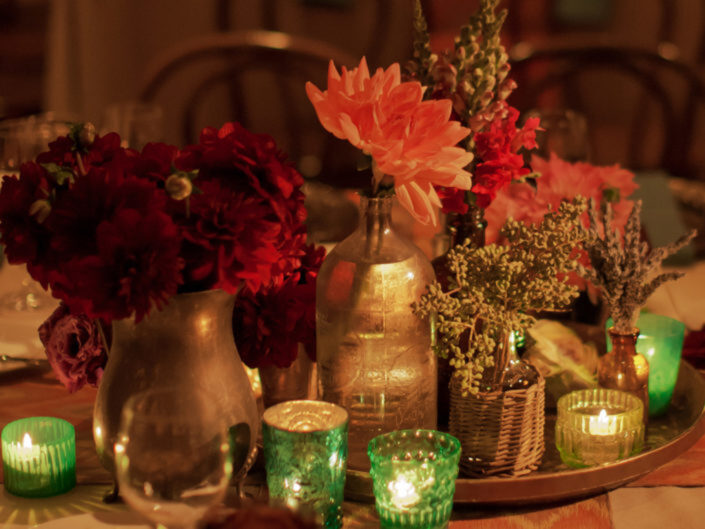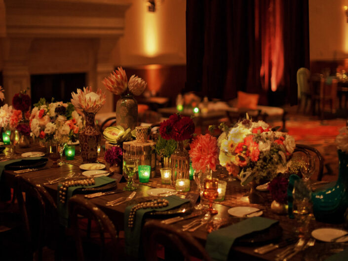 Inspired by the couple’s free-spirited bohemian nature and the bride’s love for accessories, this wedding embraced romance with global influences. The vibrant color palette featured rich jewel tones and metallics, while the ballroom transformed into a sensory celebration with a mix of lanterns, colorful glass vessels, patterned textiles, and pottery chargers. Wooden bowls of olives and nuts, combined with bold, striking florals, created a warm, eclectic ambiance. Guests discovered their table assignments on a scroll adorned with precious stones and Tibetan prayer bells, adding a unique, personal touch to the evening.