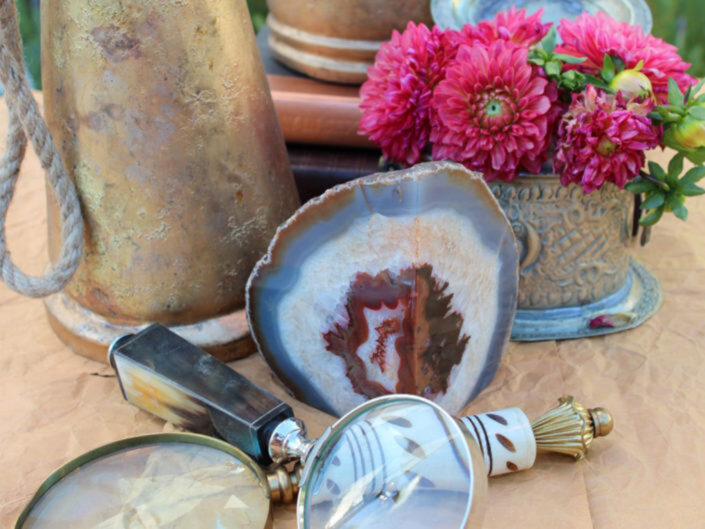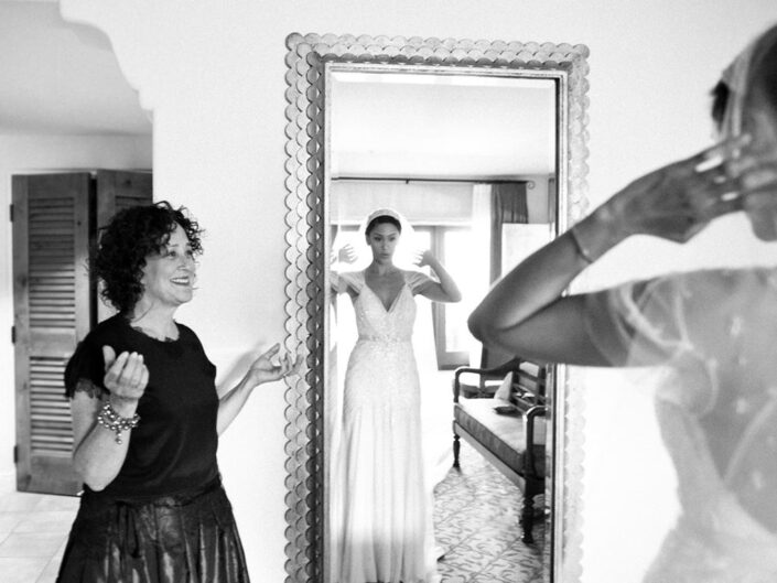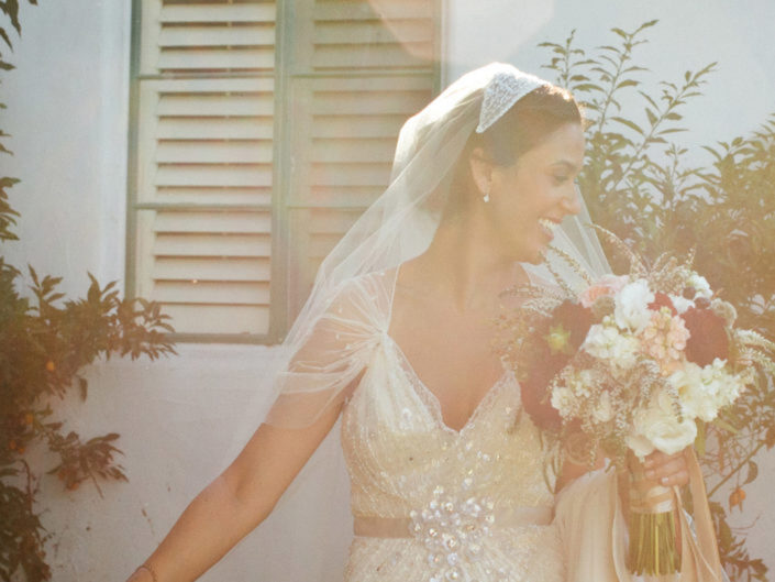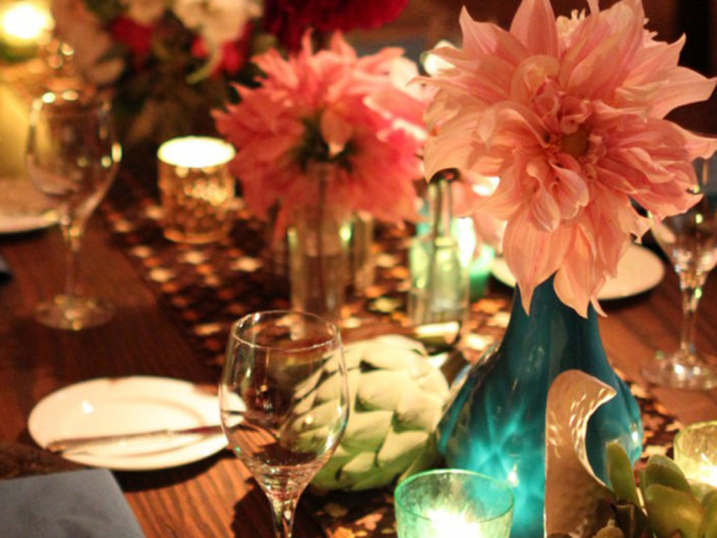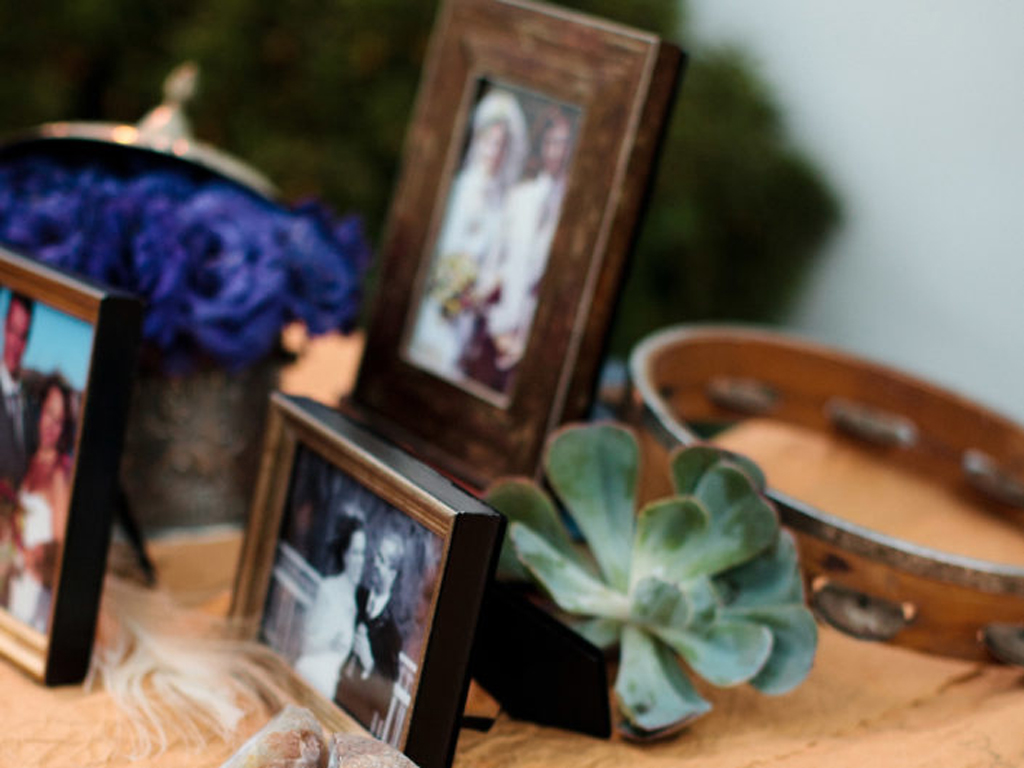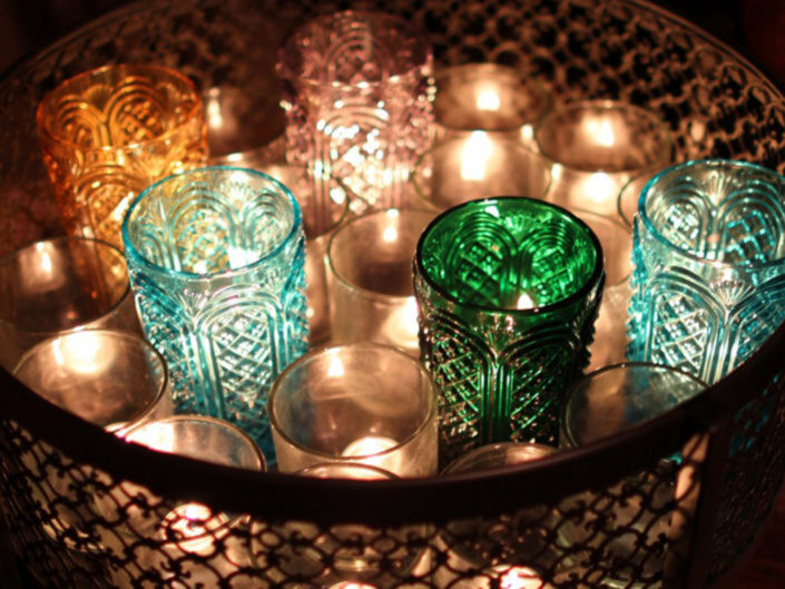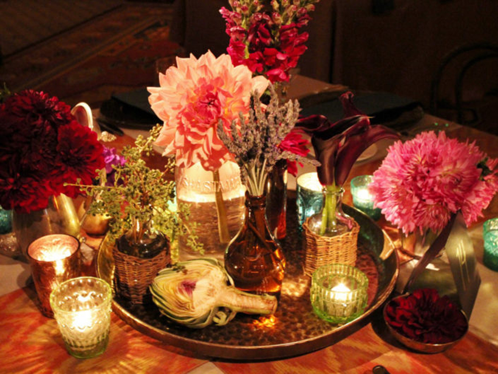 Inspired by the couple’s free-spirited bohemian nature and the bride’s love for accessories, this wedding embraced romance with global influences. The vibrant color palette featured rich jewel tones and metallics, while the ballroom transformed into a sensory celebration with a mix of lanterns, colorful glass vessels, patterned textiles, and pottery chargers. Wooden bowls of olives and nuts, combined with bold, striking florals, created a warm, eclectic ambiance. Guests discovered their table assignments on a scroll adorned with precious stones and Tibetan prayer bells, adding a unique, personal touch to the evening.