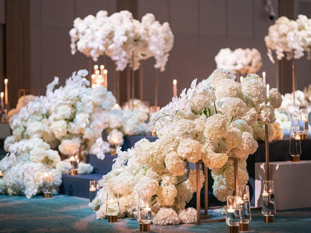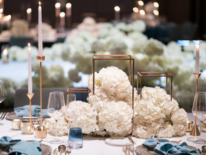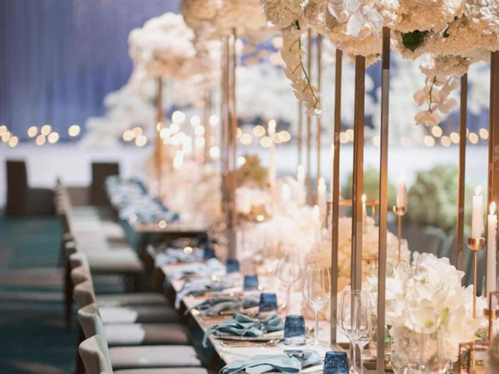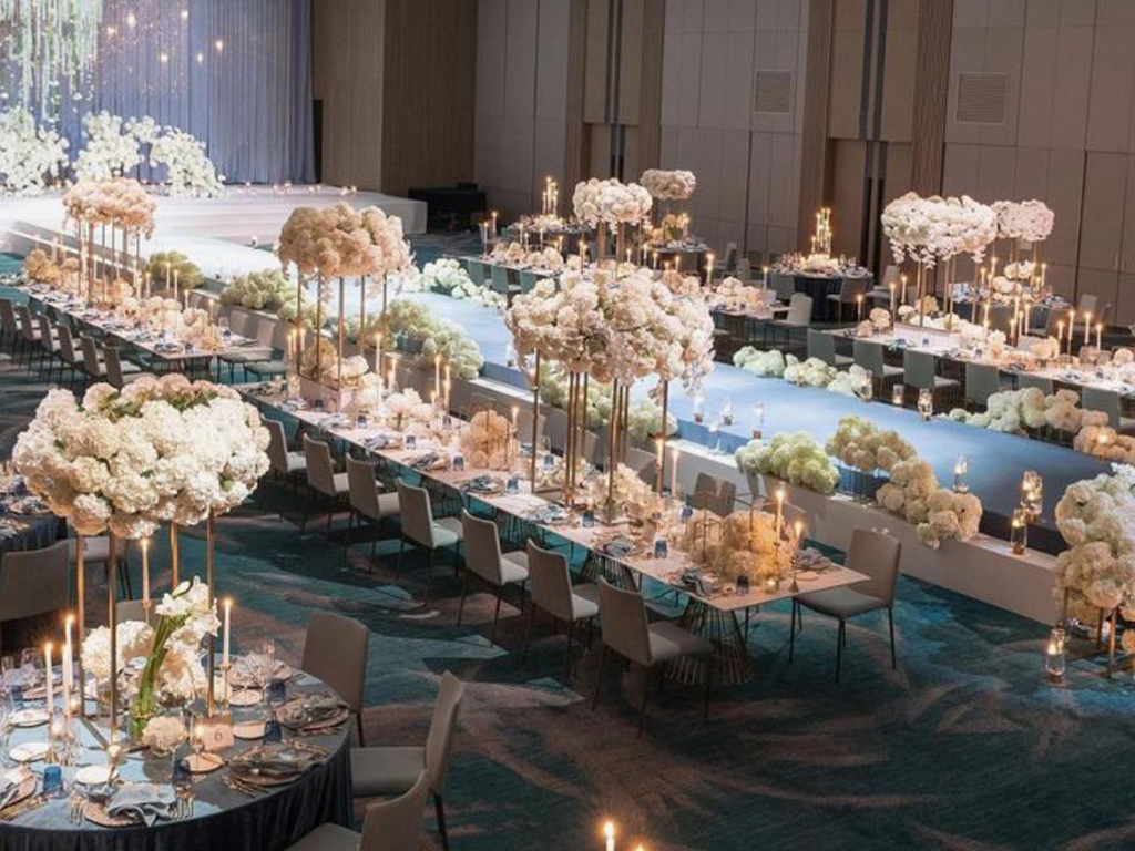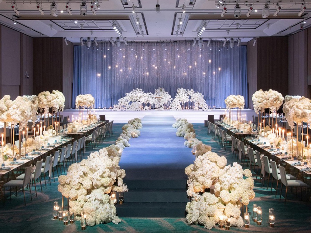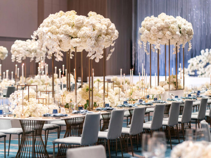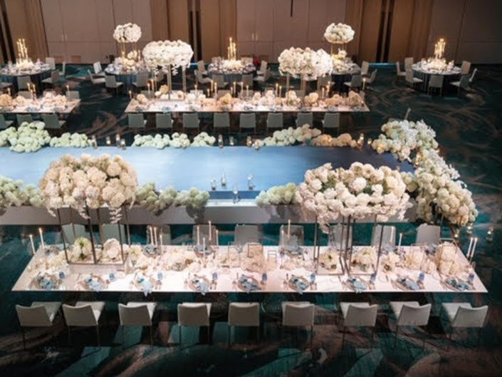 In partnership with Lotte Hotel & Resorts, Kristin Banta was once again brought in to craft an exclusive wedding design for SIGNIEL BUSAN’s Grand Ballroom. Inspired by the hotel’s panoramic views of Busan’s stunning coastline, the design showcases a refined palette of oceanic blues, complemented by monochromatic florals, creating a perfect fusion of sophistication and elegance. Set within a space where grandeur meets modern luxury, the Grand Ballroom is designed to host unforgettable weddings and events. With soaring ceilings, dazzling chandeliers, and state-of-the-art audiovisual technology, every detail is meticulously curated to elevate your special occasion. Explore the gallery below to experience the artistry and grandeur of this extraordinary setting.