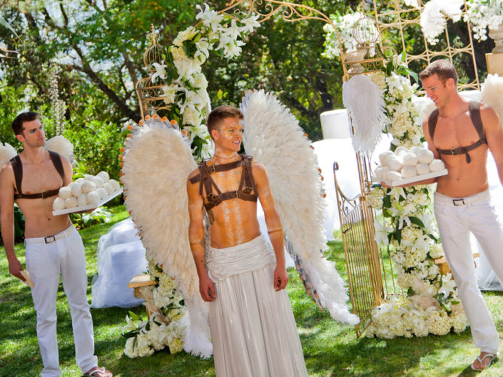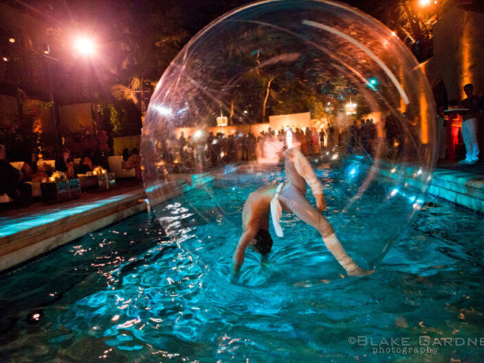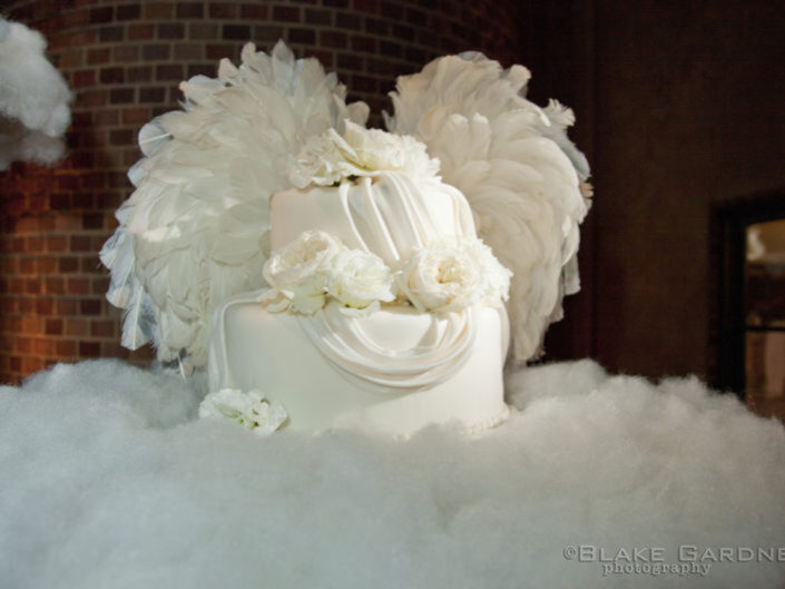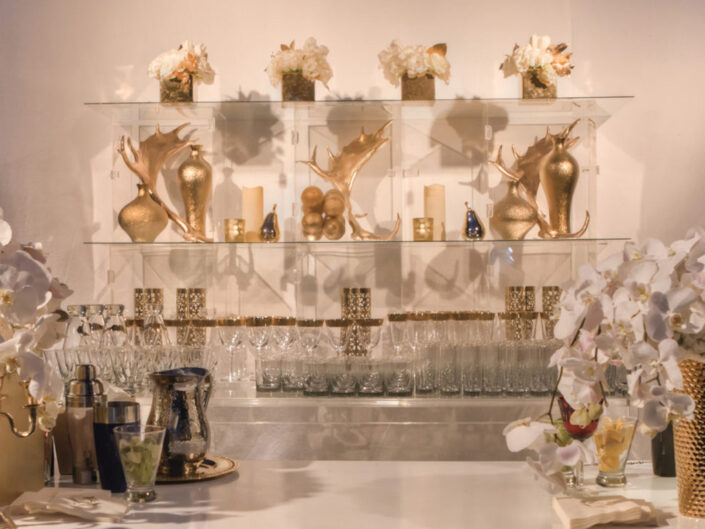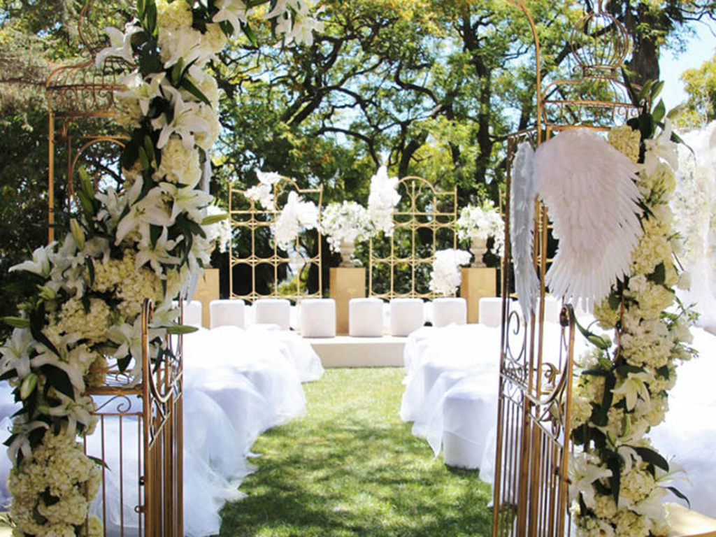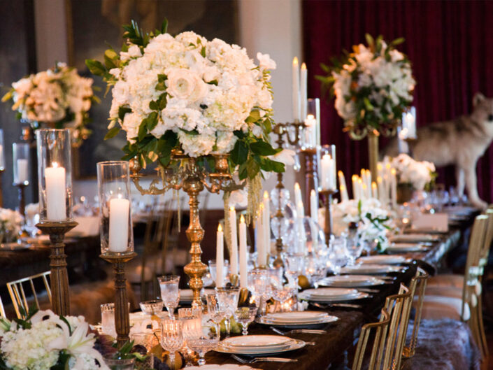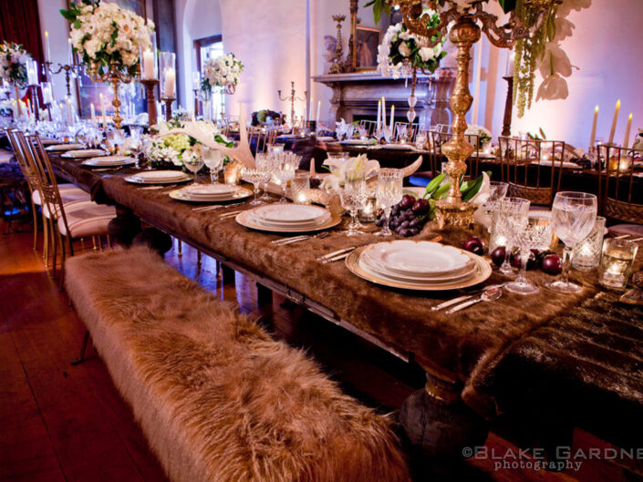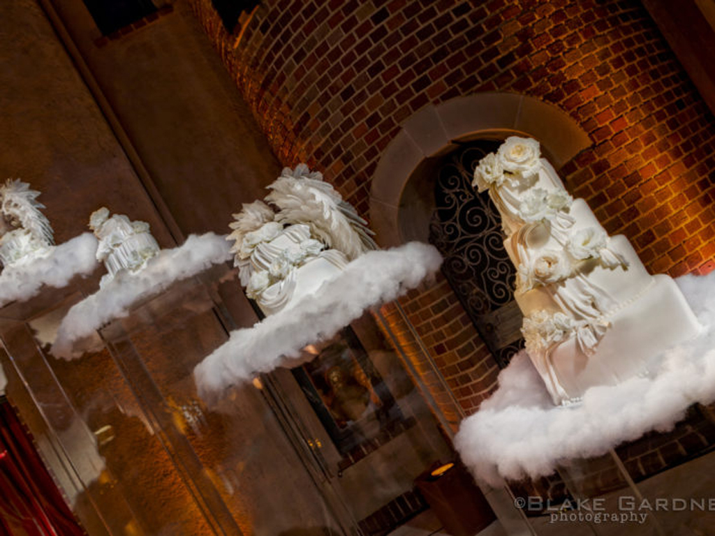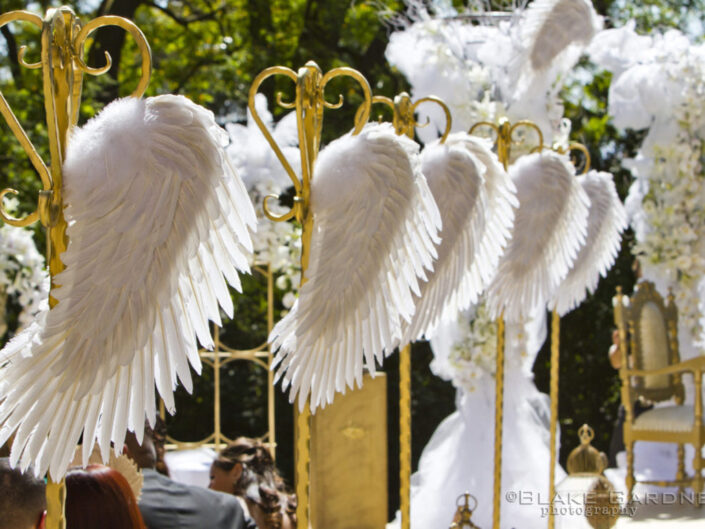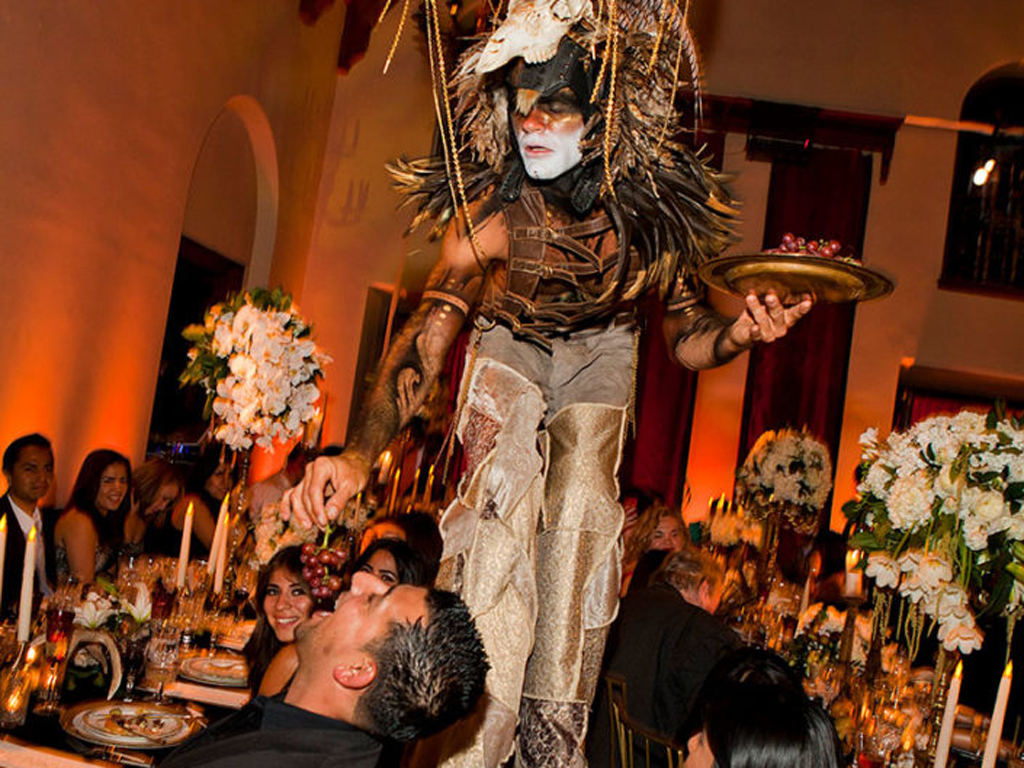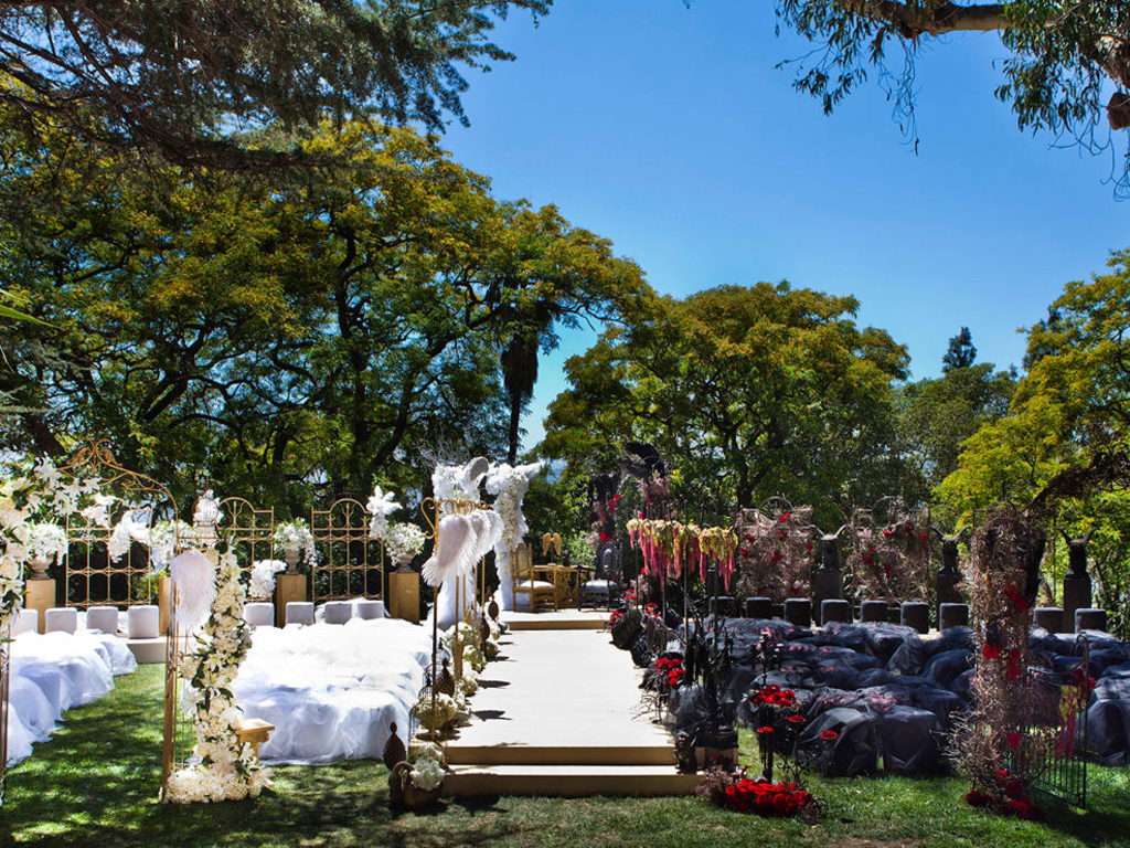 The celebration played with powerful dichotomies – heaven and hell, angels and devils, darkness and light – creating a dynamic, multidimensional experience. The ceremony introduced guests to a surreal world where angelic beings with sweeping white wings mingled with devilish greeters offering cotton candy and cocktails. A moody, underworld-themed cocktail hour followed, with servers in caged headgear presenting culinary delights in a setting both haunting and exquisite. Dinner was a hedonistic, baroque feast inspired by Middle Earth with faux mink-draped tables, gilded benches with fur throws, stacked Limoges china, crystal goblets, and animalistic stilt walkers serving grapes to guests. Entertainment included contortionists, a snake handler, and a fire-eater, keeping guests enthralled at every turn. As the night progressed, guests were led into a luminous, ethereal world featuring an exterior pool transformed into a heavenly space with floating desserts, cloud chandeliers, and a central DJ stage beneath the stars.