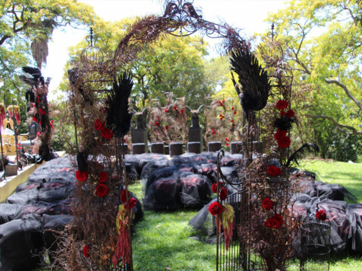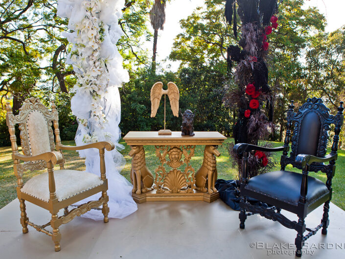 Inspired by the couple’s passionate love story and creative spirit, this wedding unfolded as an immersive, theatrical experience taking guests on a journey from the underworld to the gates of heaven. Drawing inspiration from Dante, Tolkien, and The Odyssey, the event was designed to reflect a man’s symbolic ascension from darkness into light, elevated by love and the presence of his partner.