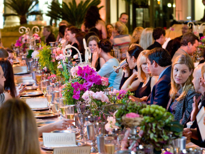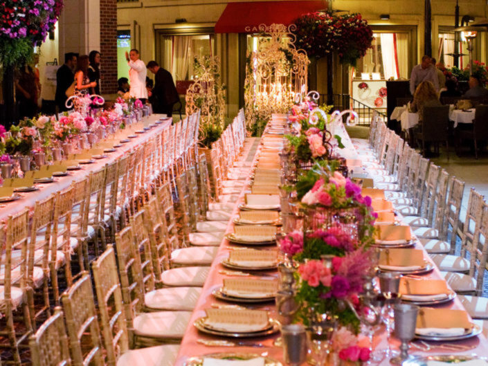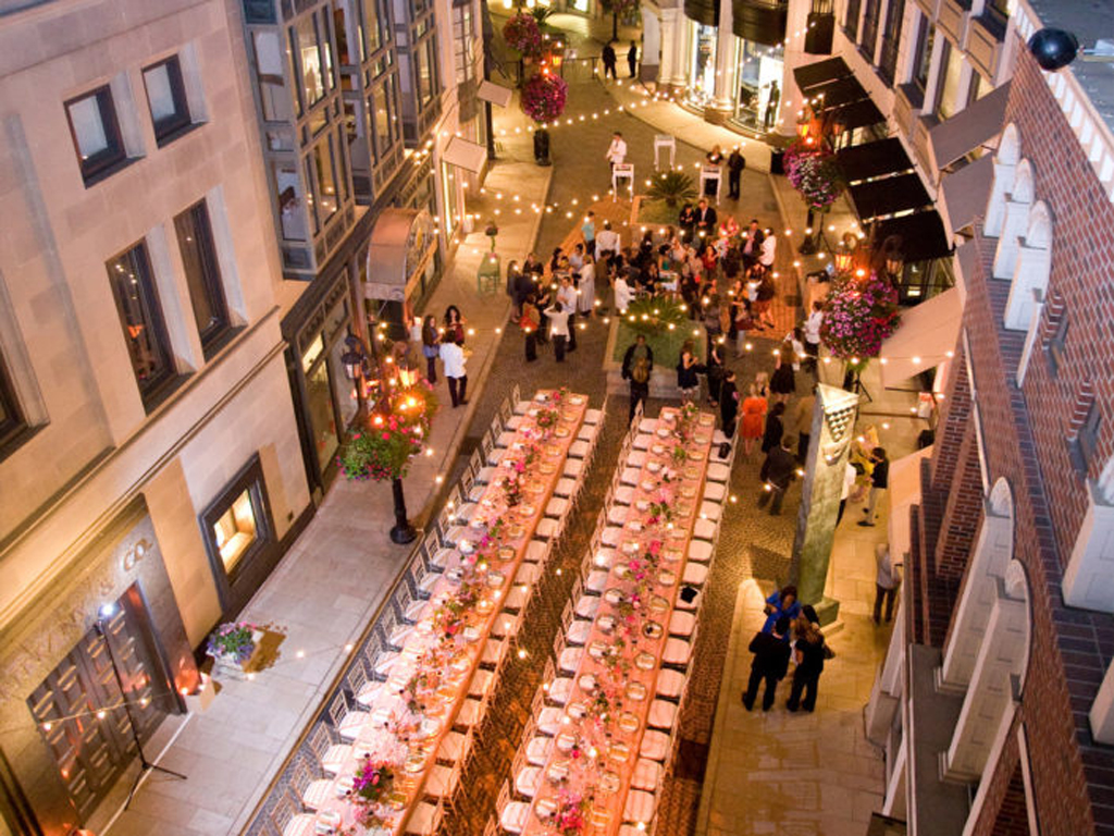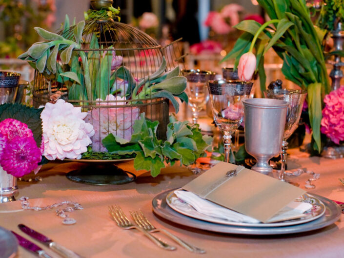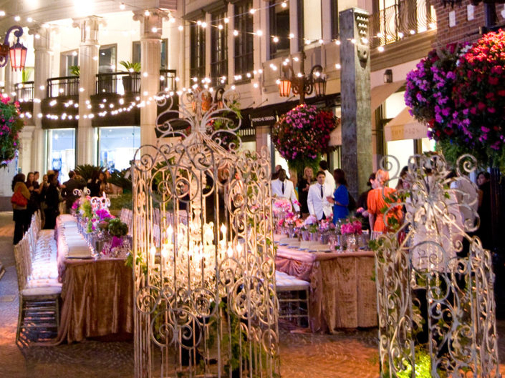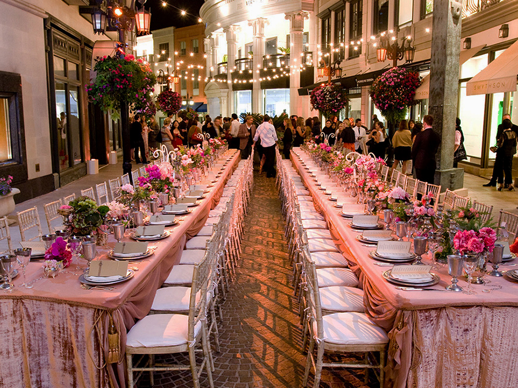 Step into the heart of France – without leaving Beverly Hills. For this intimate tastemaker evening, guests were treated to a nine-course French culinary journey set along the cobblestone street of the iconic Two Rodeo, home to designer boutiques like Versace, Jimmy Choo, Tiffany & Co., and Lanvin. Twin tables stretched down the street beneath a canopy of bistro string lights, creating a warm, romantic glow. The tablescapes were layered with vintage elegance: bustled linens draped in luxe tassels, stacked antique china, pewter goblets and chargers, and hemstitch napkins topped with ornate menus and antique brooches. Lush garden florals wove their way through silver candelabras, birdcages, and fallen crystal chandeliers for a look that felt effortlessly whimsical and opulent. A DJ spun smooth French hip-hop, elevating the ambiance and transporting guests to a countryside fête in Provence … right in the heart of Beverly Hills.