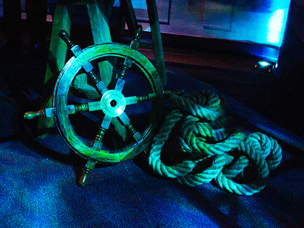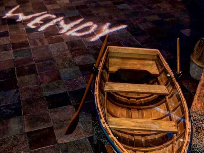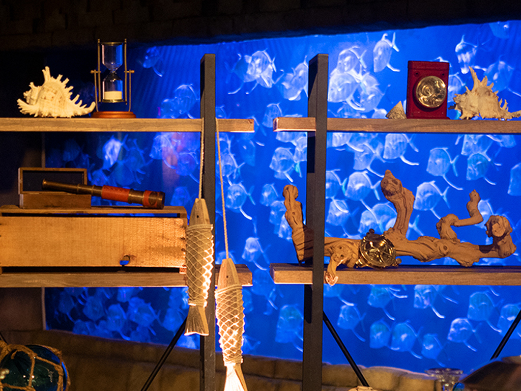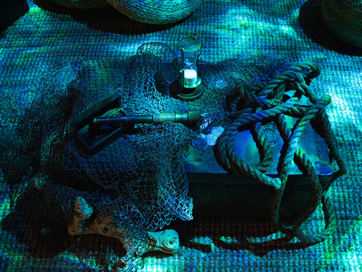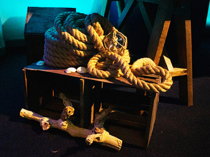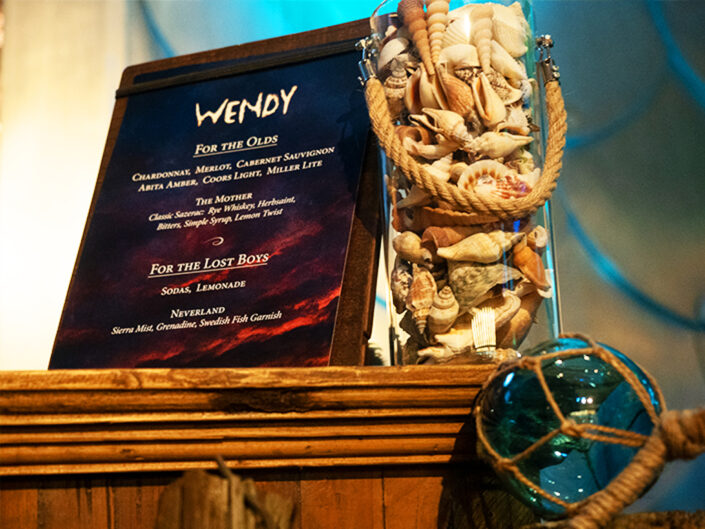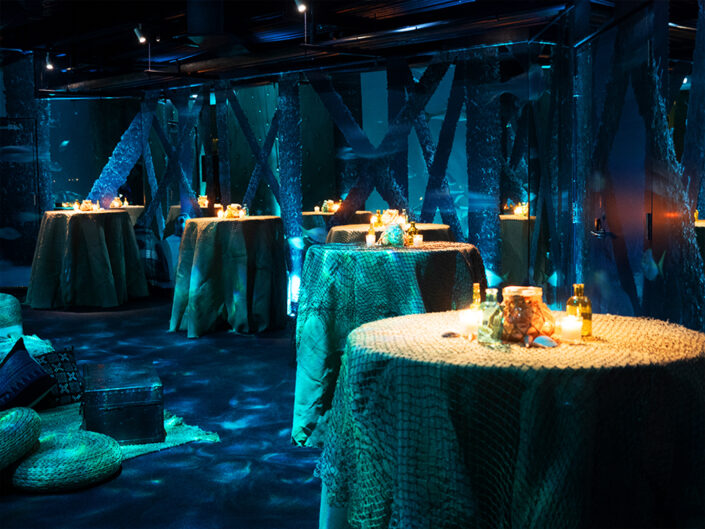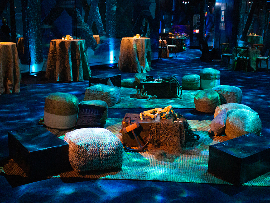 Like the film, we leaned into a palette of deep blues, golden ambers and textured earth tones, evoking the contrast between nostalgia and the unknown. The space was designed to feel as though guests had stepped into an illuminated underwater realm – where light filtered through like sunrays beneath the waves, shadows danced like shifting tides and rustic, weathered textures hinted at the remnants of forgotten adventures. Layers of nautical elements, driftwood, and organic materials echoed the film’s sense of survival and discovery, while curated lighting transformed the setting into an ethereal, submerged world. Each piece in this gallery played a role in shaping an atmosphere that was both wild and intimate, evoking the magic of childhood lost and found again.